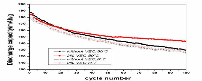 說明:在50℃加入VEC,電池的放電容量在第一百圈仍有較高的容量,從而說明VEC具有很好的高溫性能。